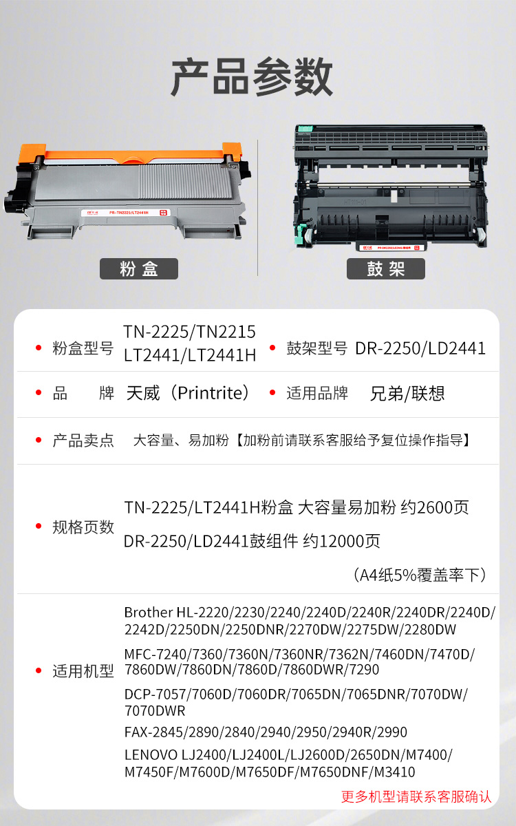 參數(shù) [品牌] 天威 [型號] 天威硒鼓TN2225粉盒 [單位] 個