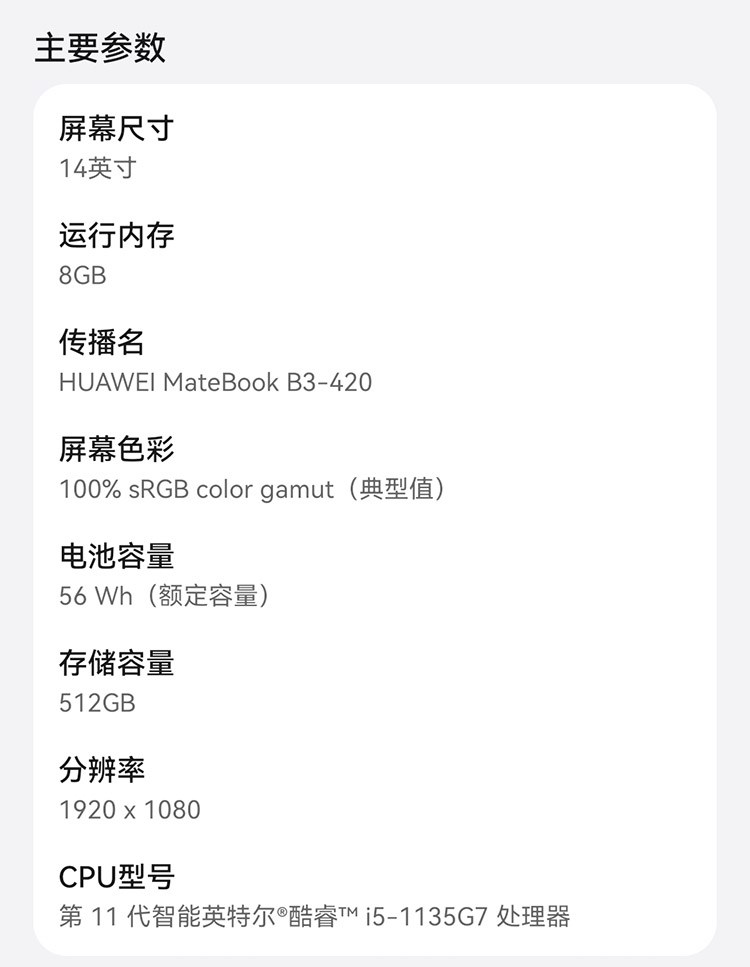 參數(shù) [品牌] 華為 [型號] MateBook B5-430 [毛重] 1.49Kg [單位] 臺